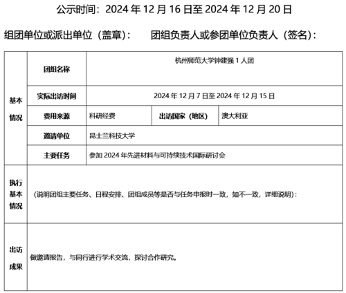 本人钟建强于2024年12月9日至13日,受邀参加2024年先进材料与可持续技术国际研讨会,并做邀请报告,报告题目为“Infrared Reflection Absorption Spectroscopy Studies of the D2O/Co(0001) Interface(D2O/Co(0001)界面的红外反射吸收光谱研究)”。同时,与会议主席Dongchen Qi教授探讨“Reconfiguration of the 3d electronic structures of manganese phthalocyanine upon nitrogen adsorption revealed by soft X-ray spectroscopy(基于软X射线光电子能谱的氮吸附调控的锰酞菁3d电子结构重构研究)”合作论文的修改和投稿,以及与与会专家讨论澳洲同步辐射光源机时的合作申请。按计划完成出访工作,并如期回国。