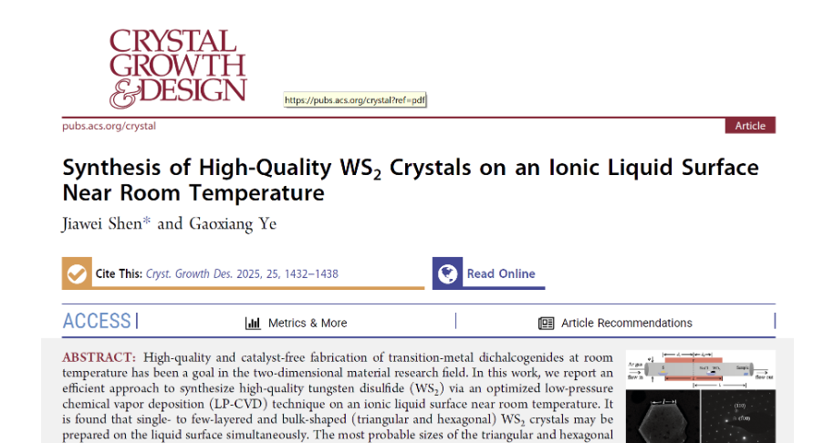 高质量、无催化剂室温制备过渡金属二硫属化物一直是二维材料研究领域的目标。本文报道了一种通过在近室温条件下离子液体表面采用优化的低压化学气相沉积(LP-CVD)法高效合成高质量二硫化钨(WS₂)的方法。研究发现,在液体表面上可同时制备出单层至数层以及块状(三角形和六边形)的WS₂晶体。其中,三角形和六边形WS₂晶体的最概然尺寸分别为574.7±18.4 nm和399.3±41.0 nm。具有多重同心六边形结构的WS₂晶体的平均平台宽度约为35 nm。基于实验结果,我们提出了WS₂晶体的三阶段生长模型。该工作深化了对相关晶体生长机制的理解,并证明了采用液体基底制备晶体的优势。