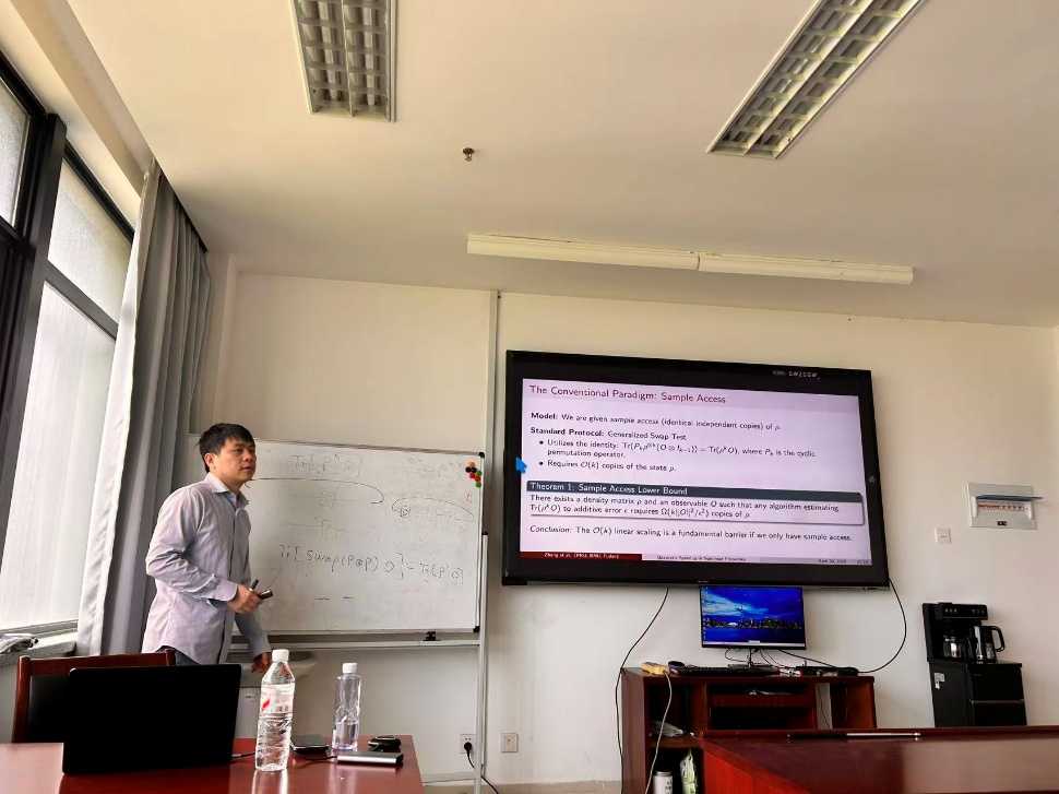 报告中,袁骁研究员围绕量子信息科学中的一个基础任务——量子态非线性泛函的测量展开系统介绍。对于形如 $\text{Tr}(\rho^k O)$ 的 $k$ 阶非线性量,通常认为其计算一般需要 $\mathcal{O}(k)$ 份量子态 $\rho$ 的拷贝。袁骁研究员首先从量子态的样本访问出发,严格建立了这一复杂度下界,阐明了传统访问模型下测量高阶非线性量所面临的基本限制。随后,报告进一步介绍了纯化访问情形下的最新研究进展。在这一访问模型中,可通过一个幺正操作制备量子态 $\rho$ 的纯化形式,该场景在量子模拟与量子计算中具有自然的物理对应。报告指出,在纯化访问条件下,原有的线性复杂度限制可以被突破,相应问题的复杂度下界可降至 $\Theta(\sqrt{k})$。同时,袁骁研究员还介绍了一种能够达到该下界的量子算法,展示了相较于传统样本访问方法的二次加速优势。
